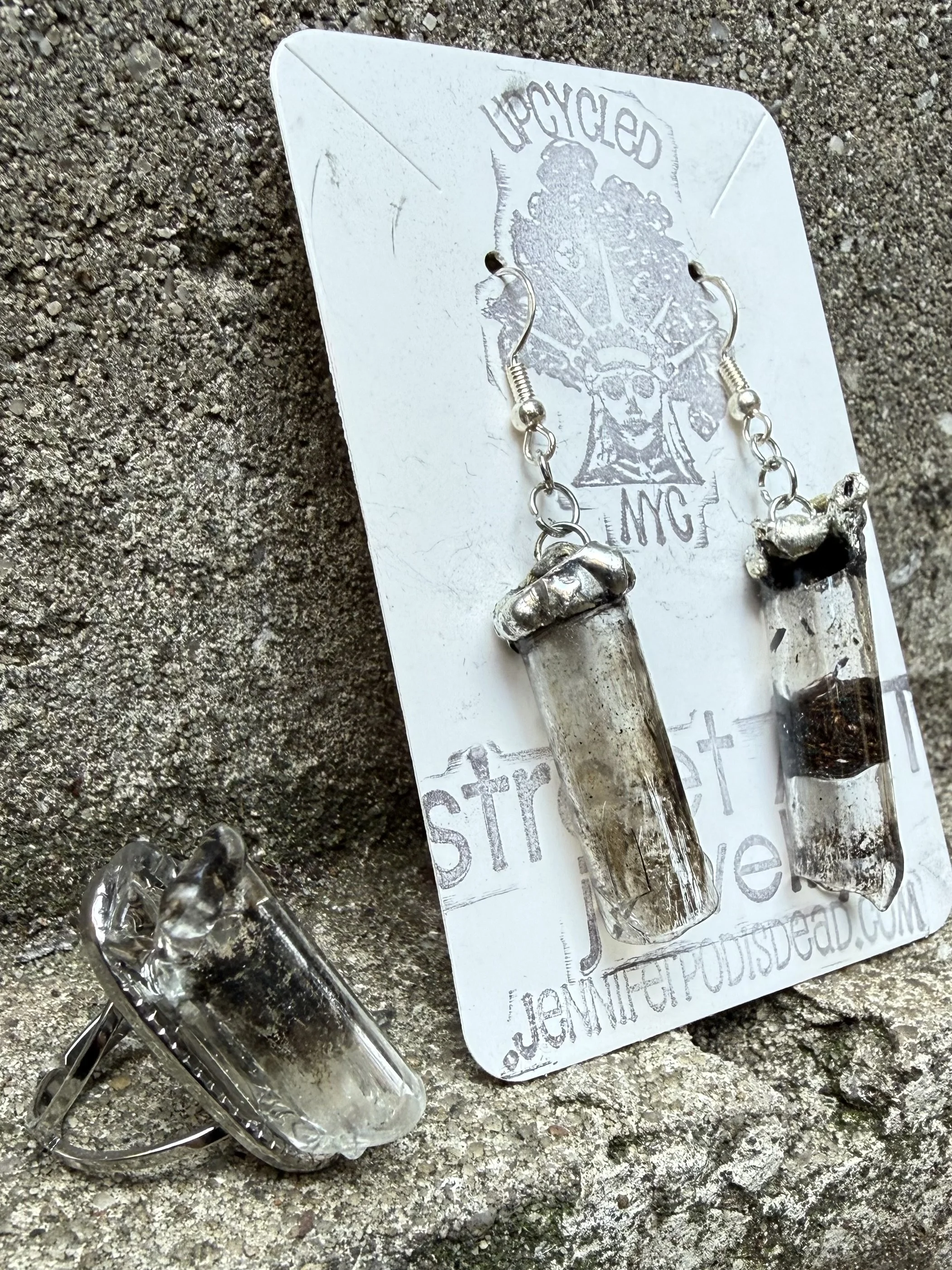 UPCYCLED STREET ART JEWELRY Created with various found objects off the city streets. MTA Metrocard Earrings Crack Pipe Earrings & Ring Street Penny Necklace Plastic Bottle Earrings Graffiti Cap Bracelet Plastic Bottle Earrings Bodega Bag Earrings Cat Pins Plastic Cup Earrings Glass Fragment Pizza